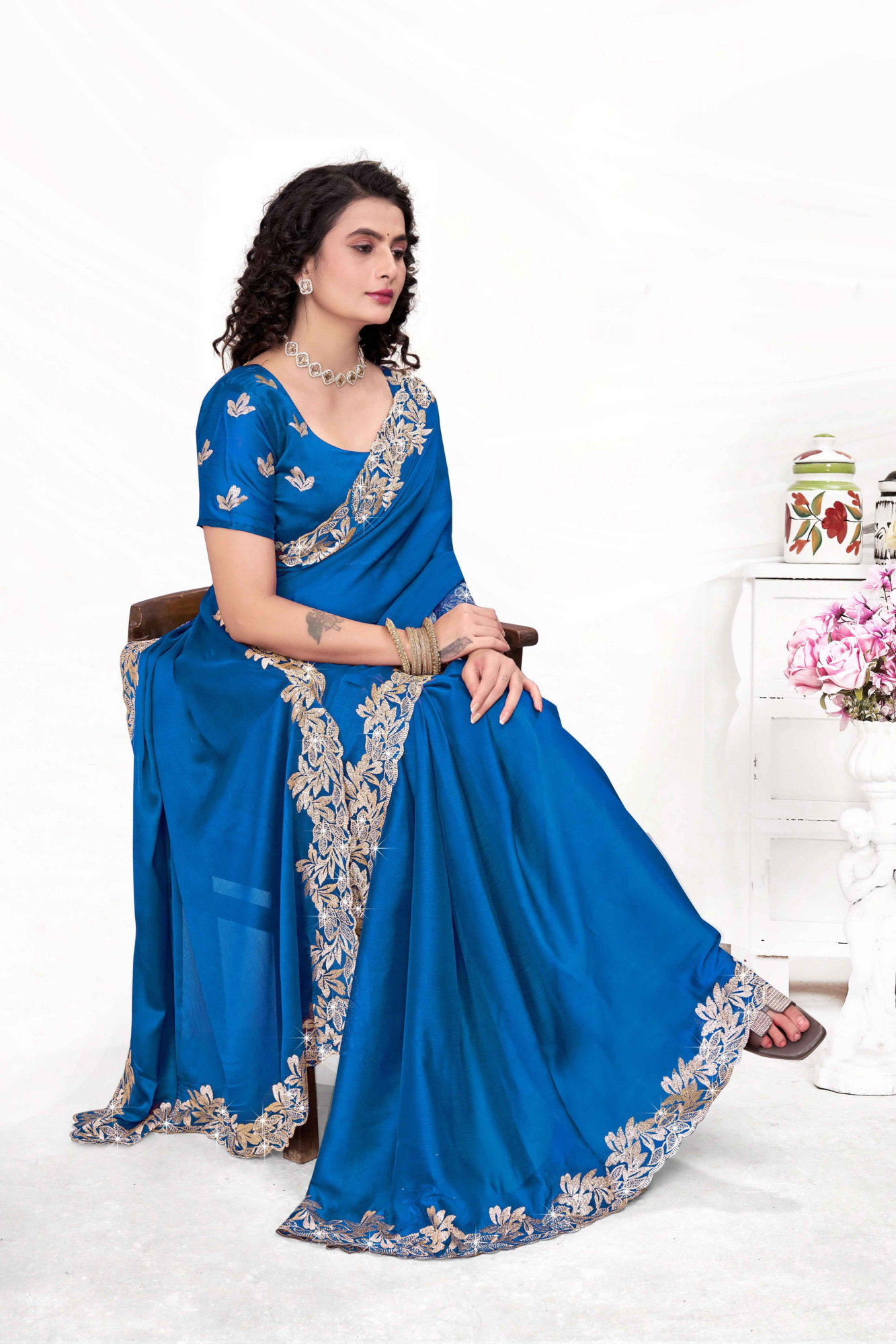 - Description: Perfect for celebrations, this embroidered saree comes with a designer blouse for a complete festive look.