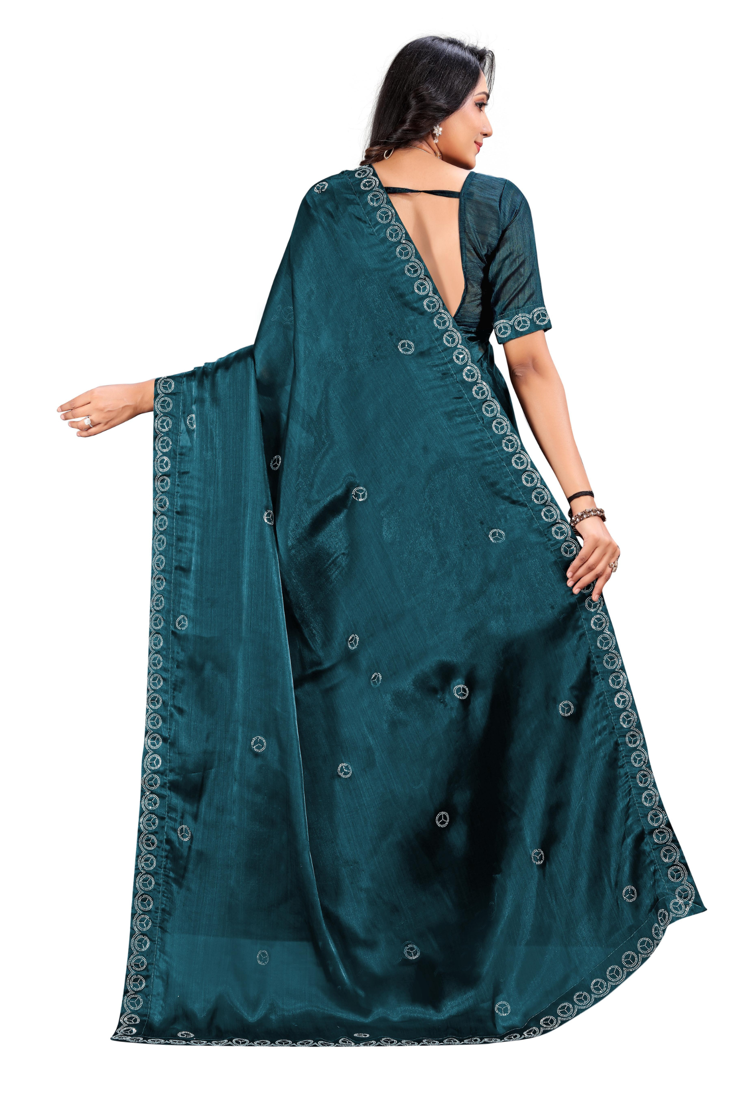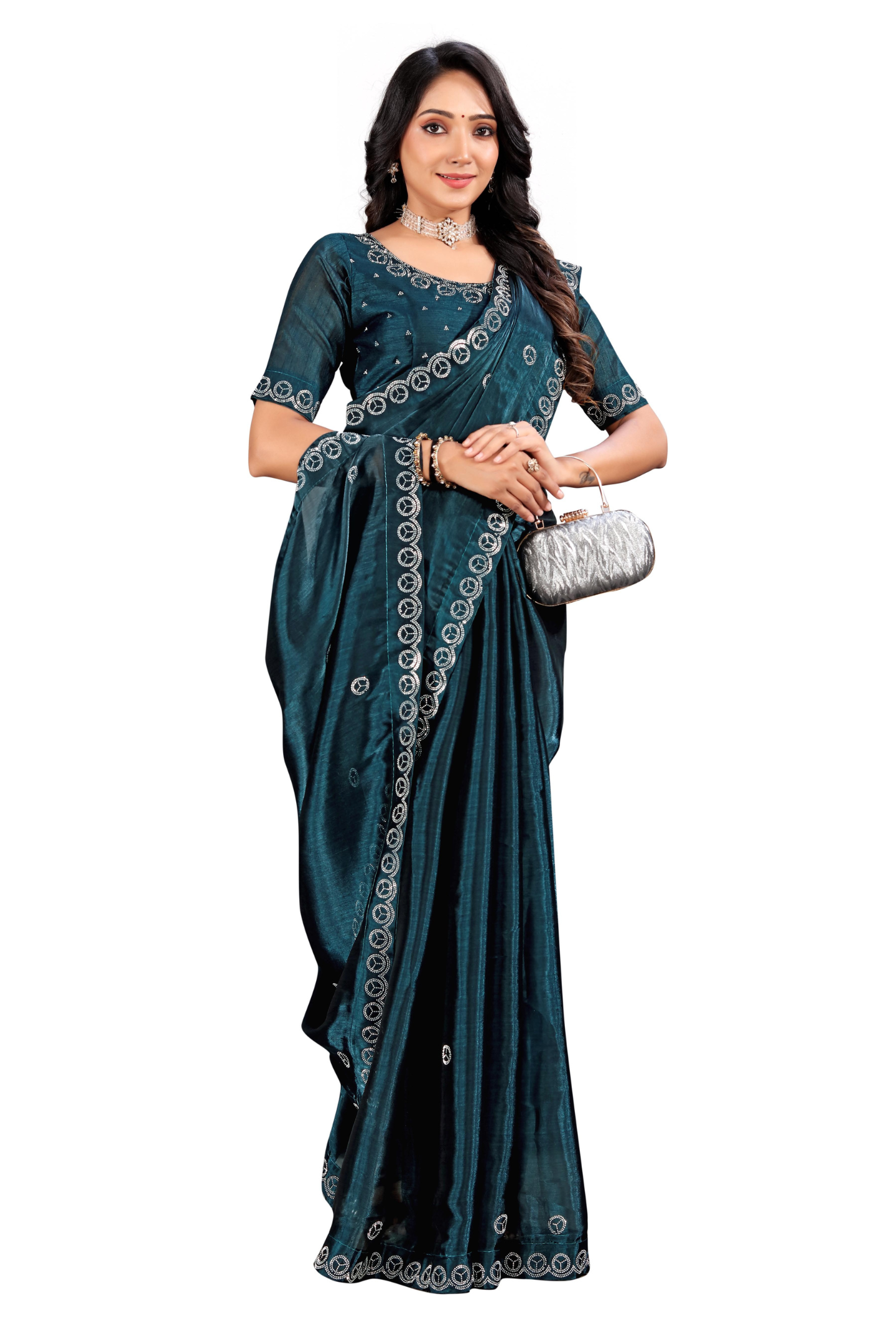 Navy Blue Toned And Silver Stone Work Saree With Border Has Silver Stones Detail.