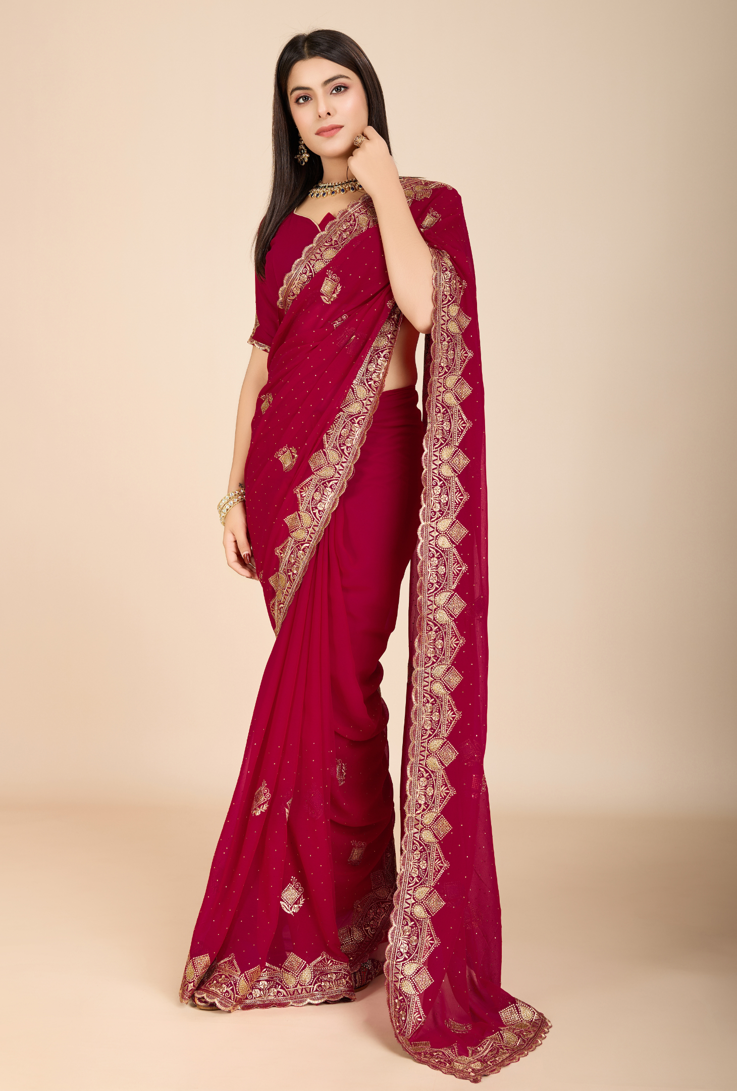 Elegant Deep Maroon Saree with Intricate Golden Embroidery Perfect for Weddings & Festive Occasions