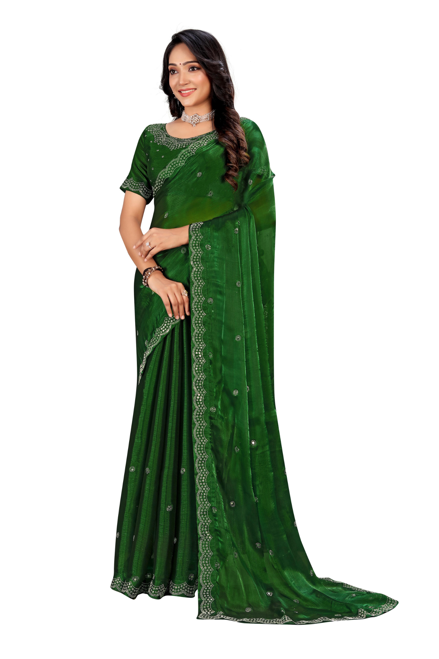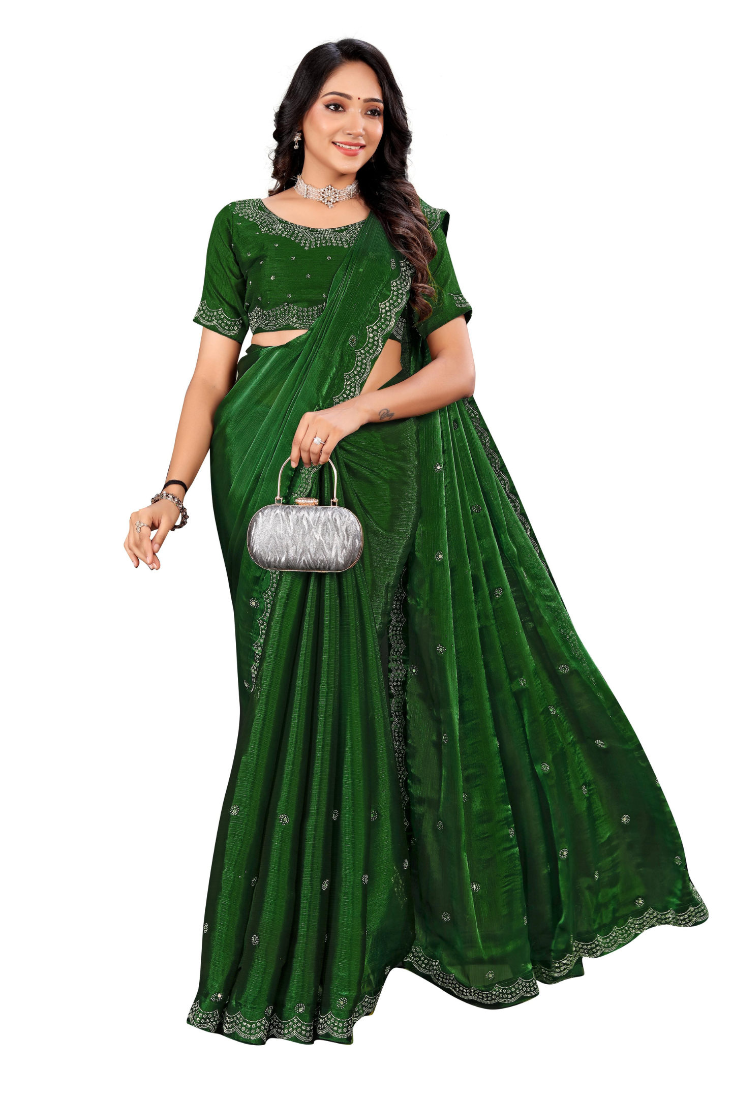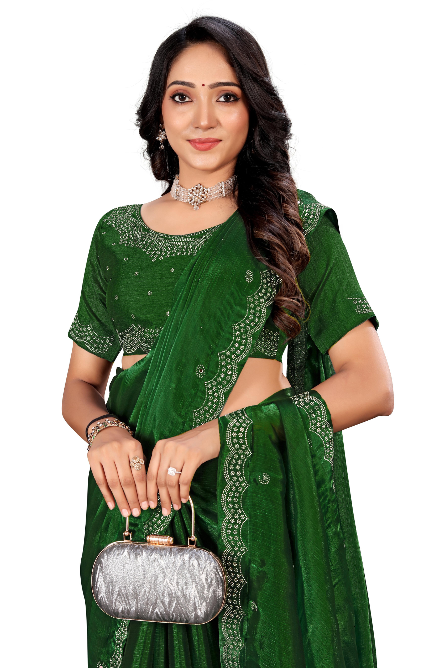 Green Toned And Silver Stone Work Saree With Border Has Silver Stones Detail.